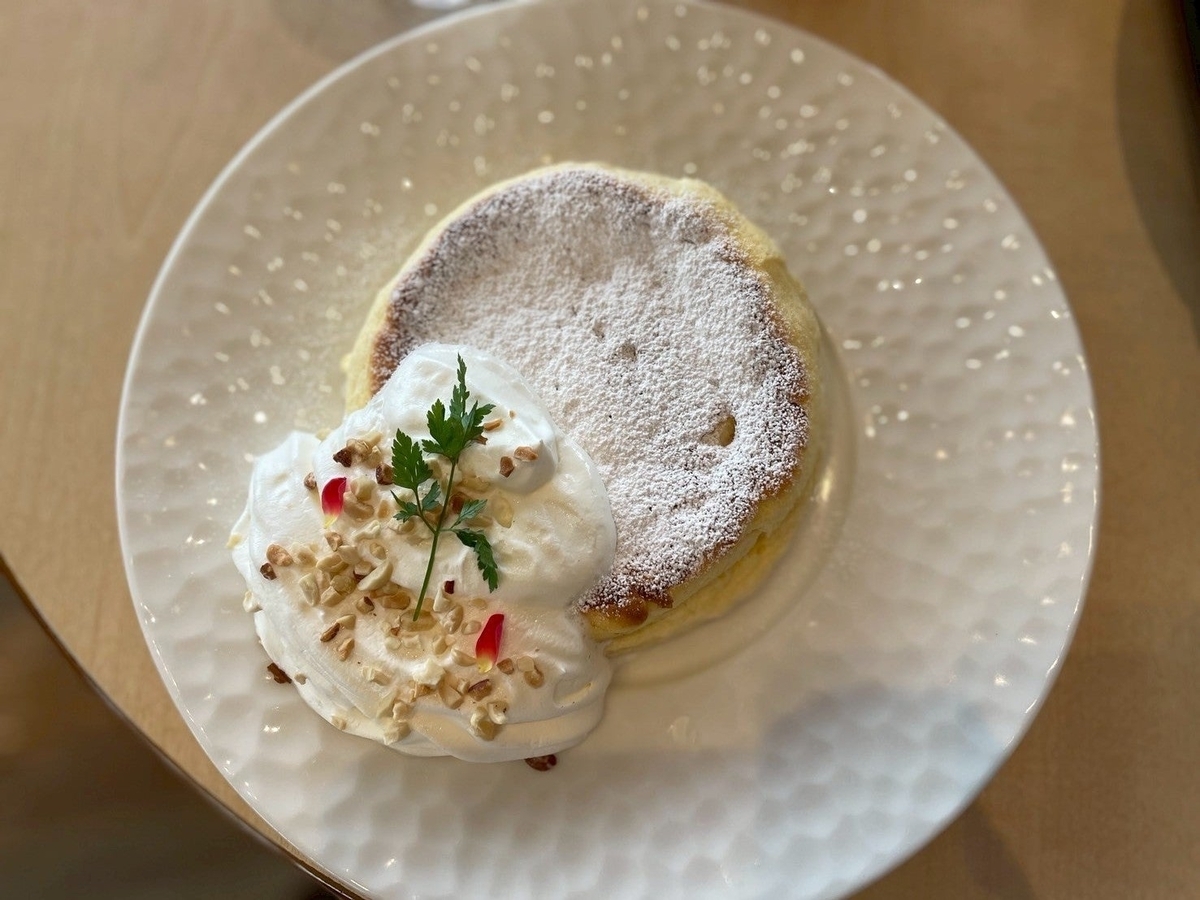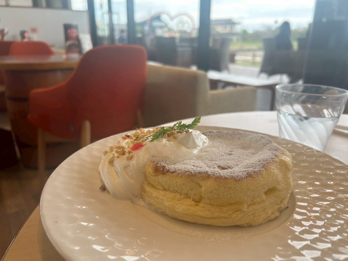 砂沼の景色を眺めながら、ふわふわパンケーキ。