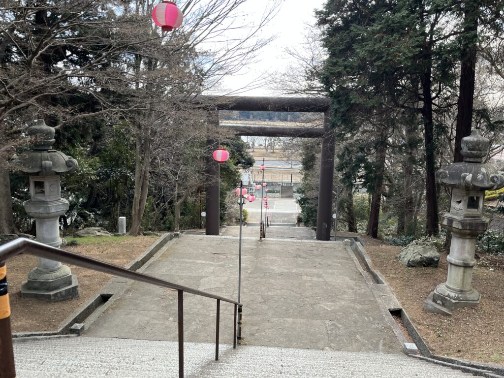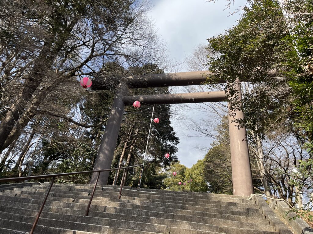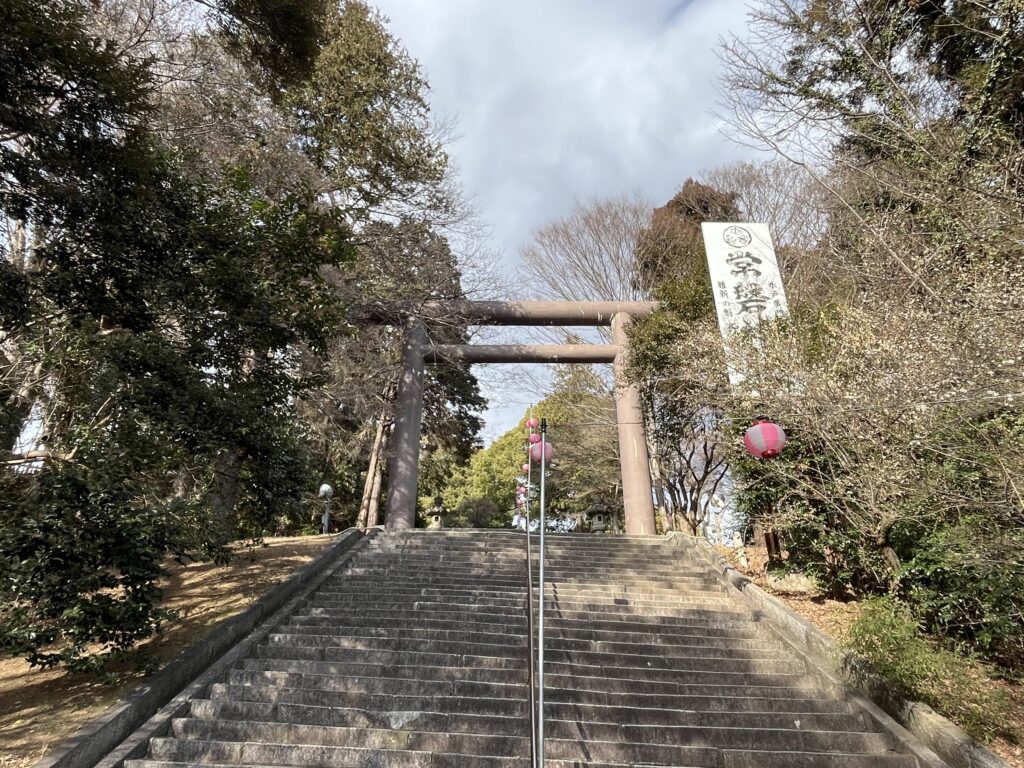 常磐神社の鳥居をくぐると、目の前に現れるのがズラッと続く石段。