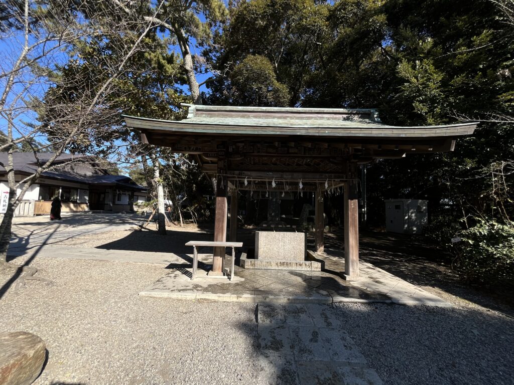 手水舎でお清め中、海風ビュービュー🌀