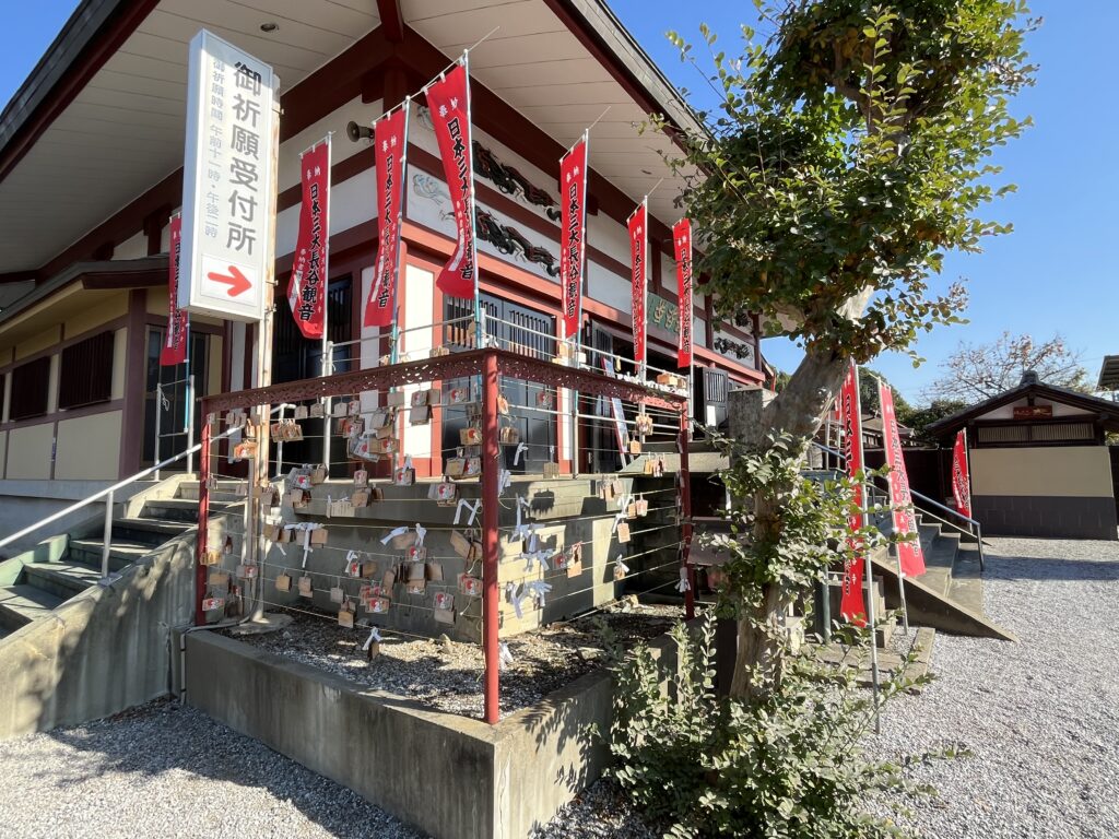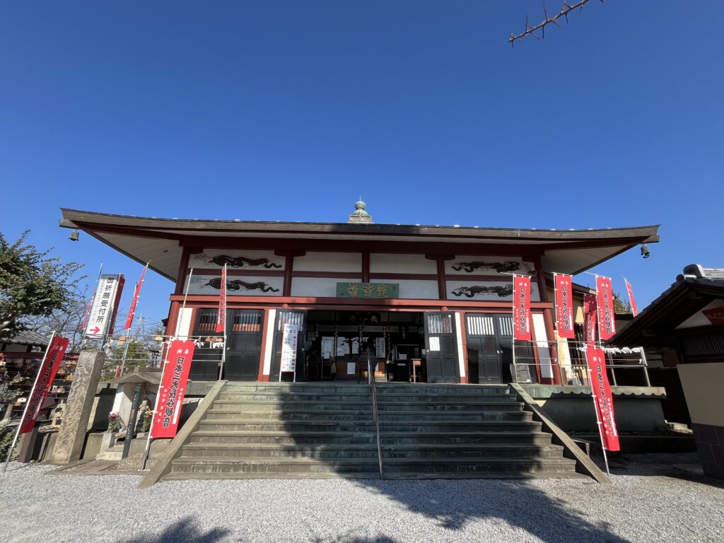 のぼりが並ぶ参道を進むと、正面に現れるのが立派な本堂です。