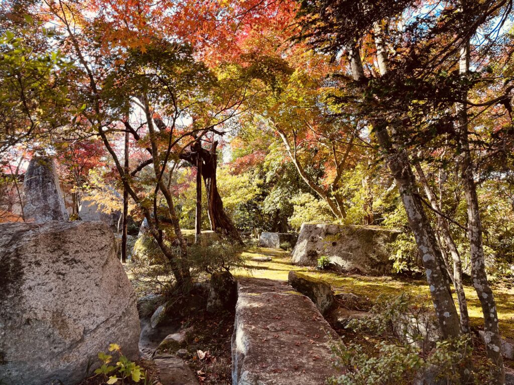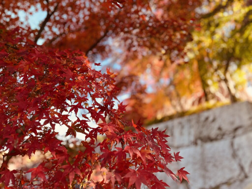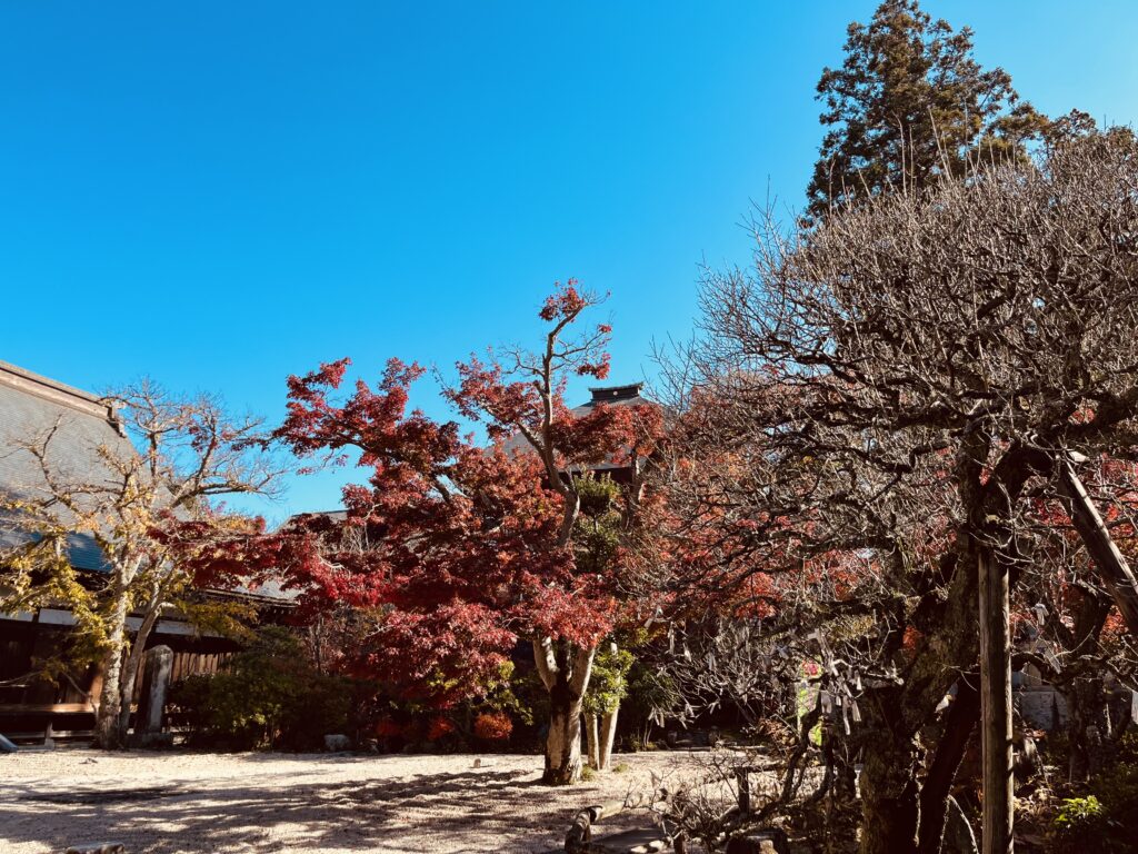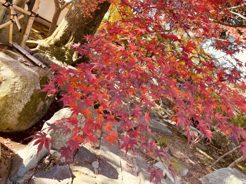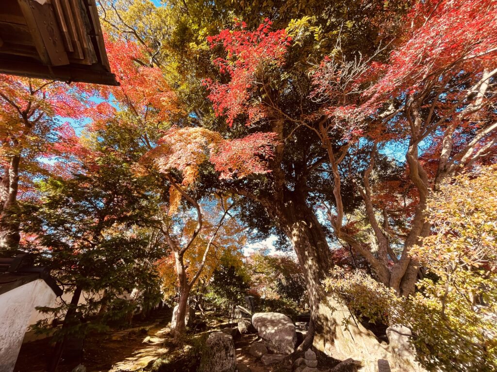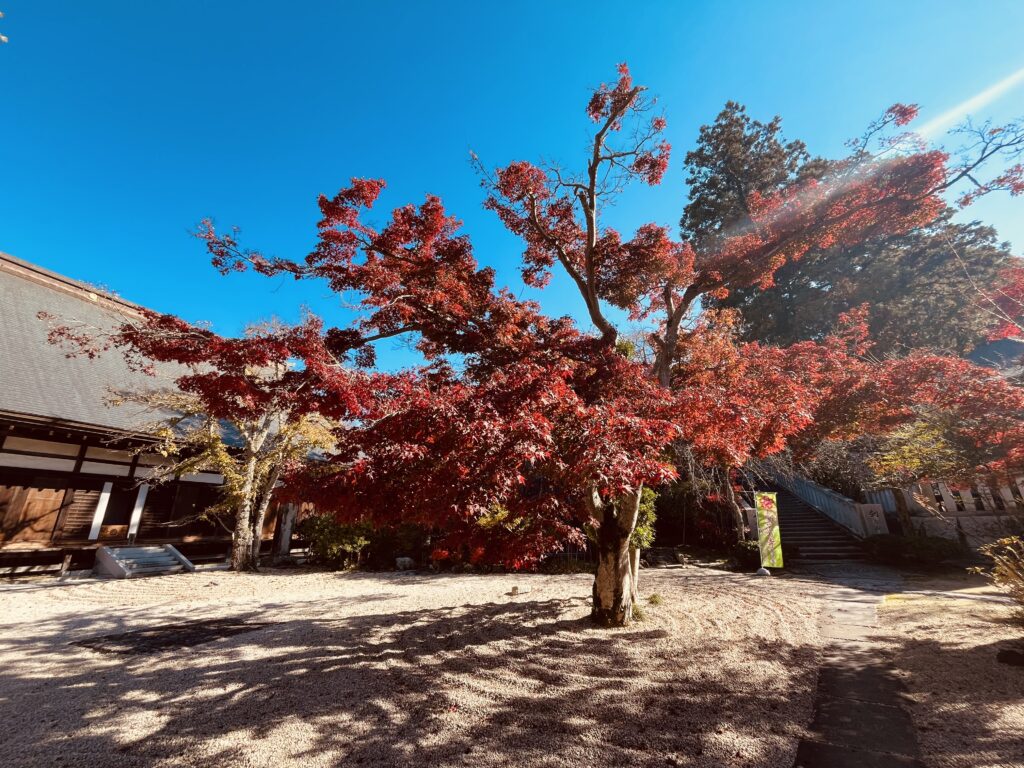 月山寺の紅葉は、ただ「色がついている」だけではなく、庭園の海のような砂紋、参道を包む木の影、落ち葉の静かな音まで含めて“秋の時間”を味わわせてくれます。赤・橙・黄のグラデーションに包まれた寺の景色に、ふと立ち止まり、ゆっくりと呼ましょうましょう。