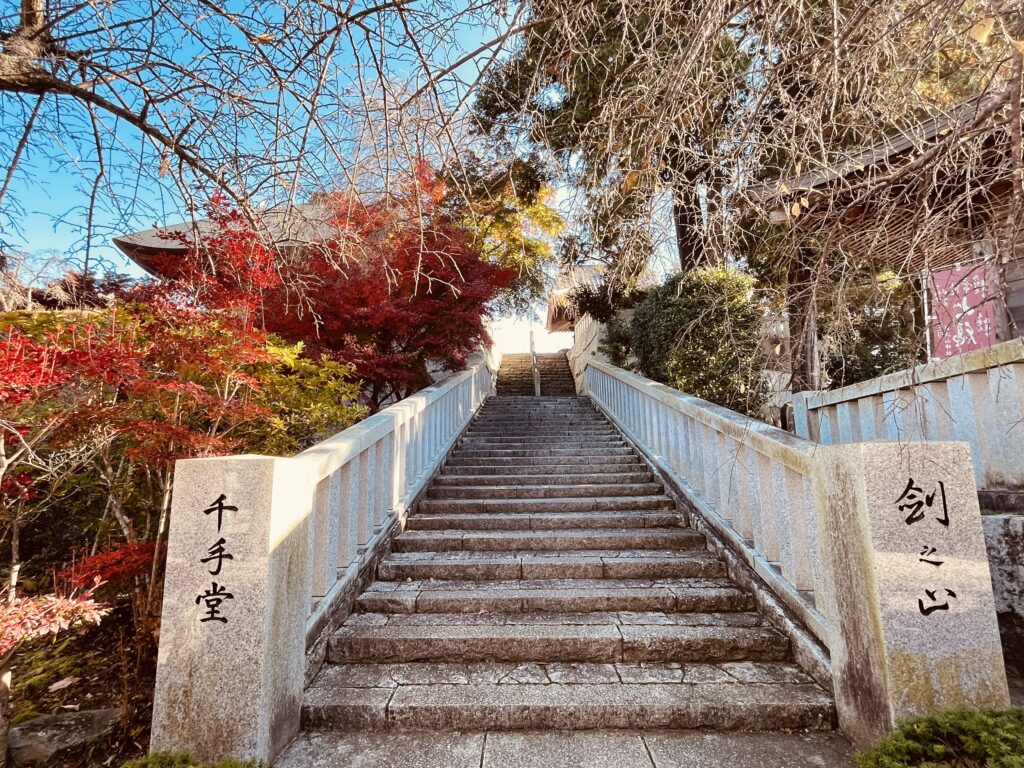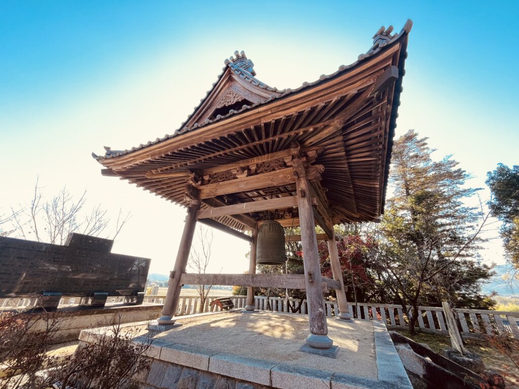 石段を登ると、鐘楼や千手千眼観世音菩薩立像が祀られています。