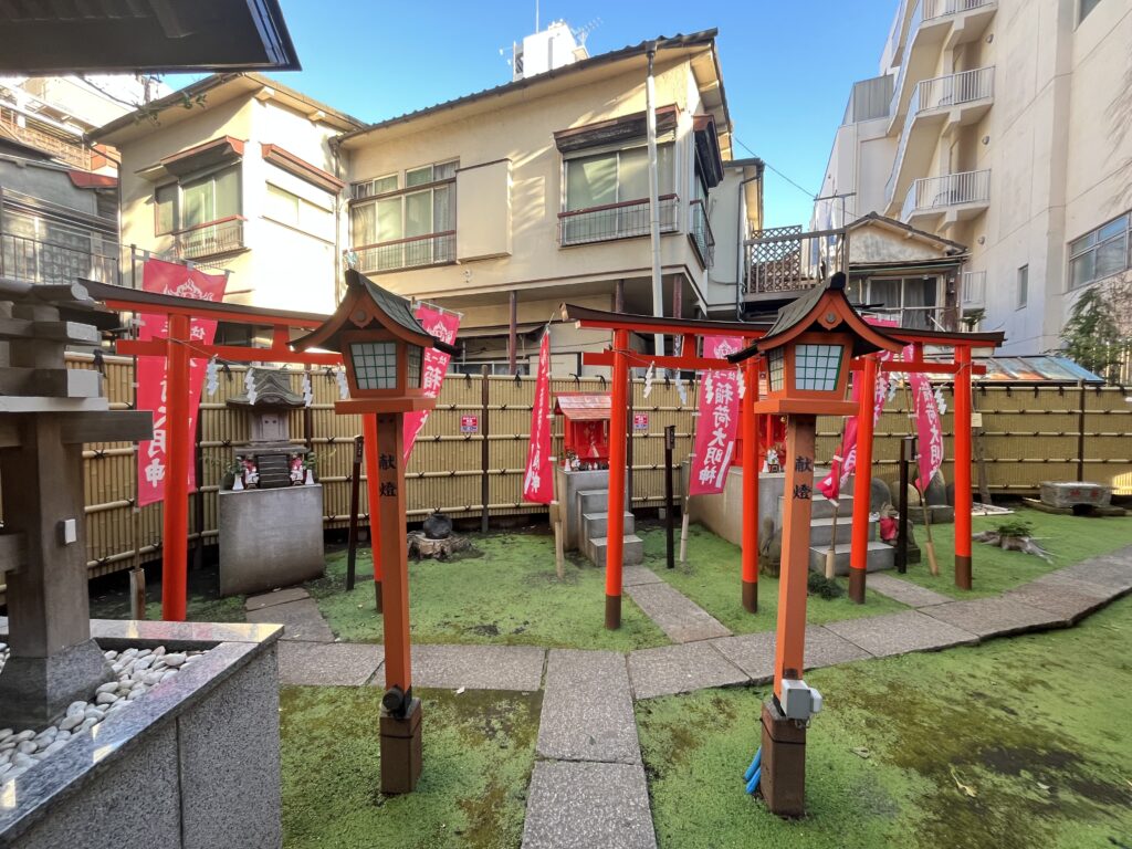 気象神社の拝殿裏に立つ、稲荷大明神の鳥居。