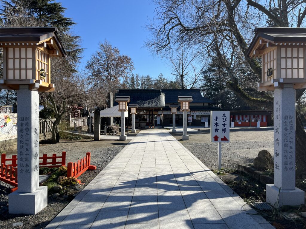 大前恵比寿神社の御祭神は 恵比寿大神(事代主神)。商売繁盛や福運を招く神さまとして古くから信仰されています。この神社は 大前神社 の境内社として建てられたもので、恵比寿さまと大前神社の主祭神である大国主神(大黒様)を合わせて「二福神」と呼ぶこともあるんだそうです。