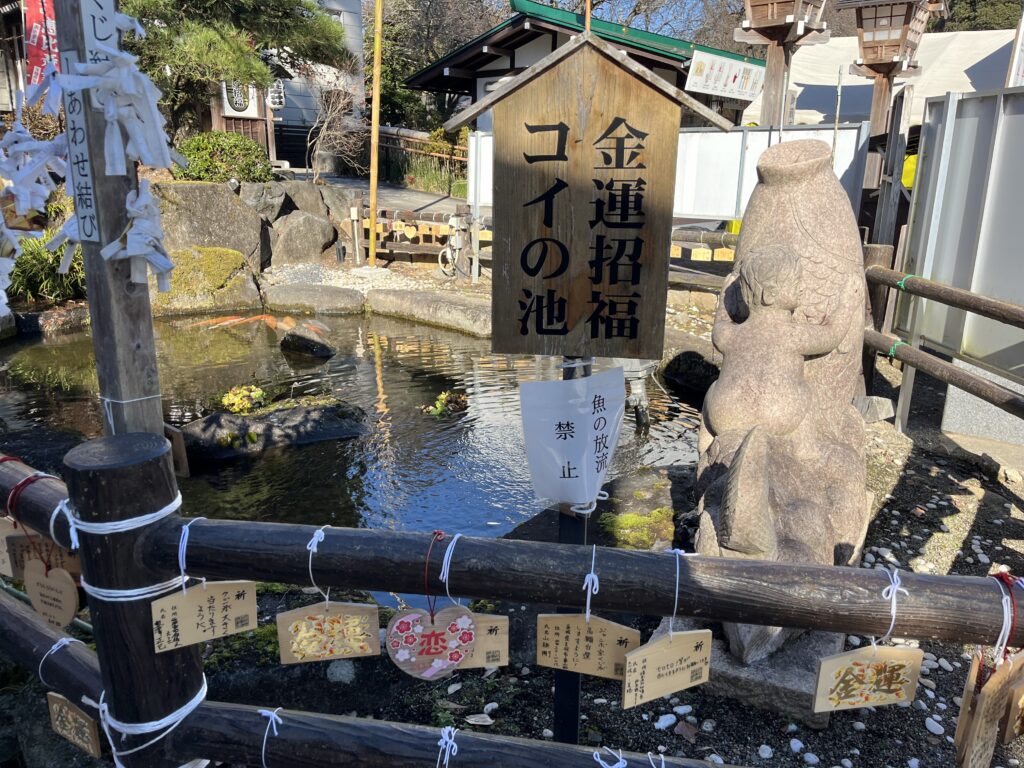 入り口には、商売繁盛・金運招福と書かれた小判型のサインがあり、拝殿内部には金の釜・金の鈴・金の鯉などがあり、金運の運気が上昇するらしいです。